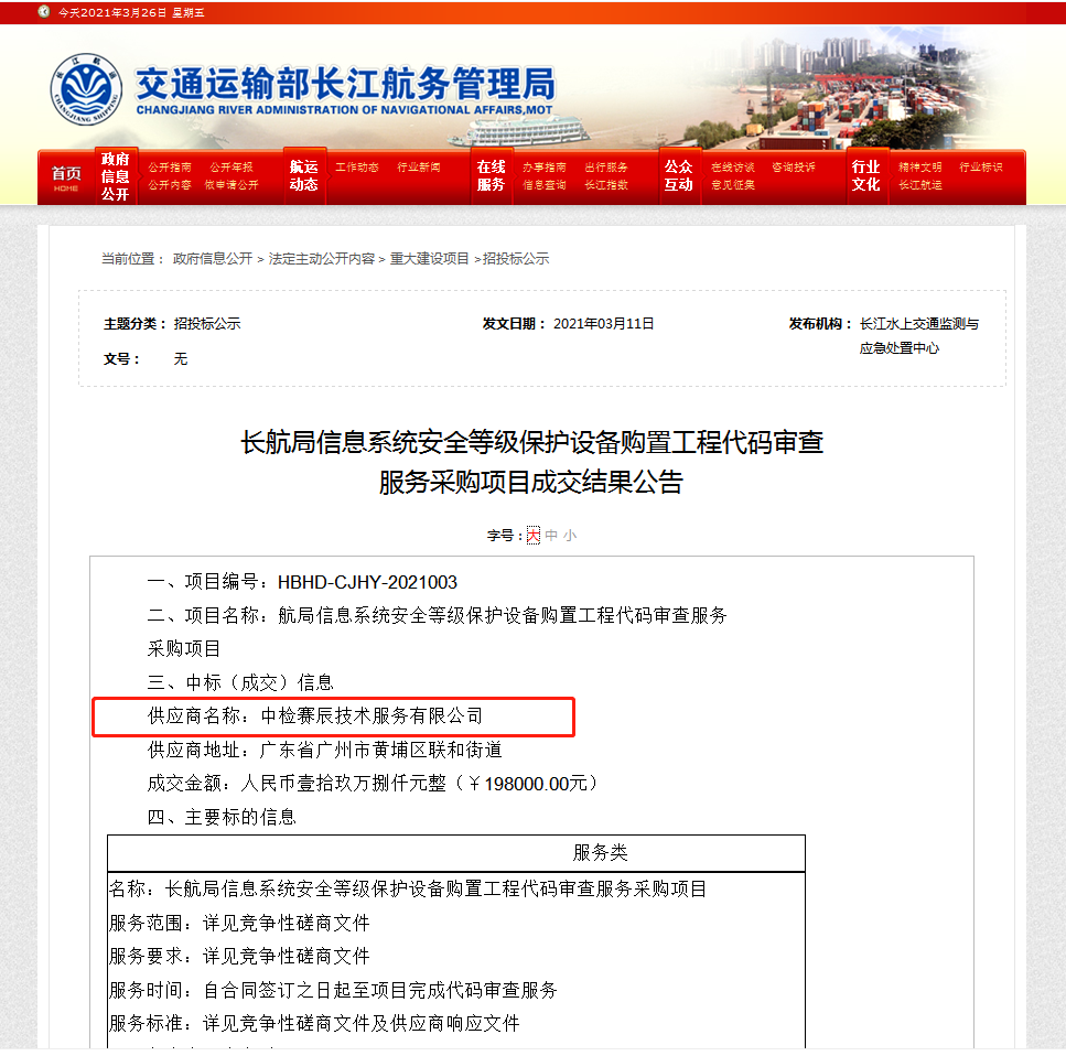 賽辰成功中標長航局信息系統安全等級保護設備購置工程代碼審查服務采購項目