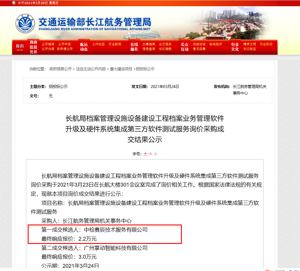 賽辰中標長航局檔案管理設施設備建設工程檔案業務管理軟件升級及硬件系統集成第三方軟件測試服務