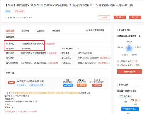 祝賀中檢賽辰技術(shù)服務(wù)有限公司(簡稱“賽辰”)成功中標(biāo)中國南京紅色在線-南京紅色文化資源展示和利用平臺項(xiàng)目第三方測試服務(wù)項(xiàng)目,中標(biāo)金額:298000元!